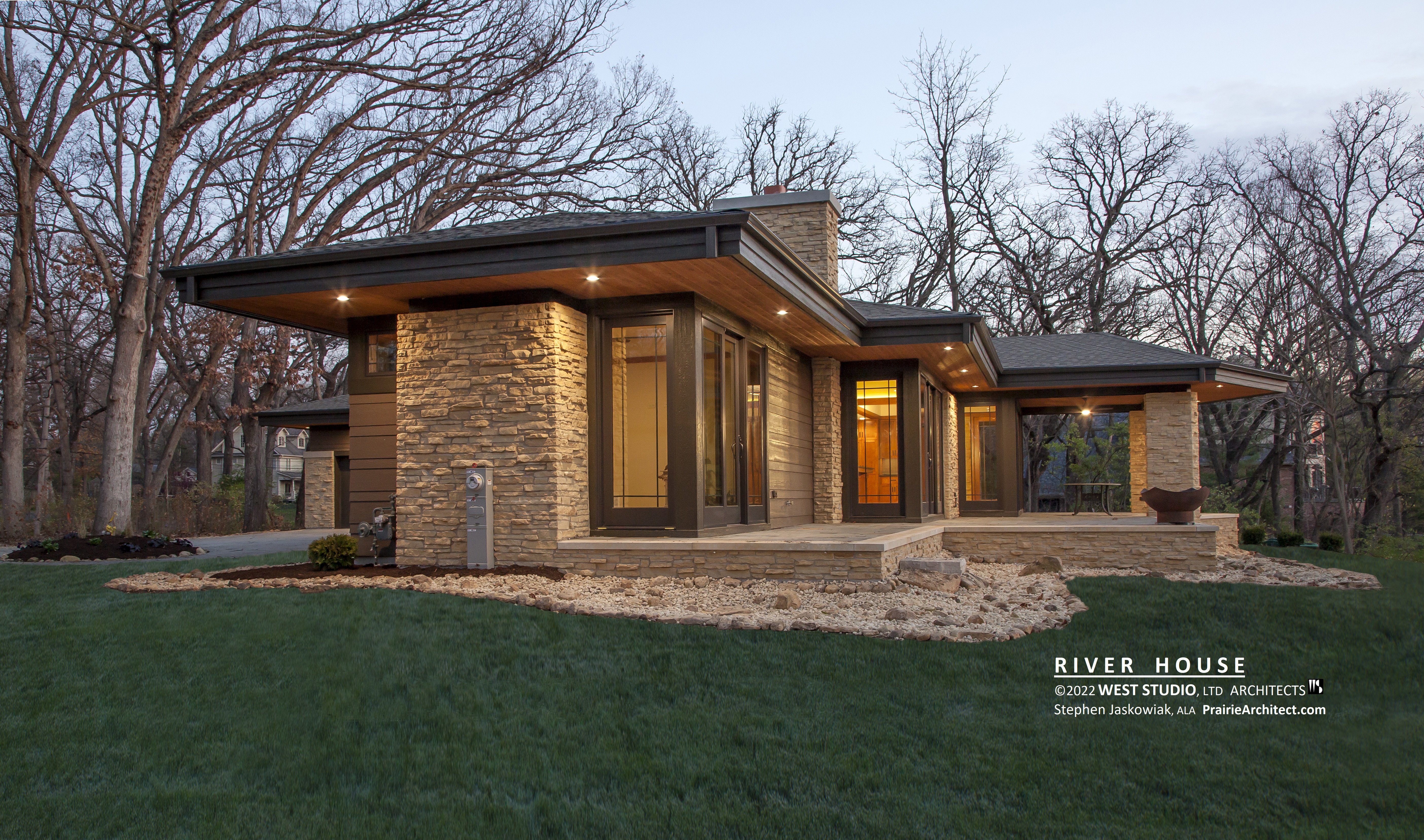 River House Modern Prairie, Modern Usonian House, Mid-Century, Frank Lloyd Wright Inspired, West Studio Architects, Stephen Jaskowiak